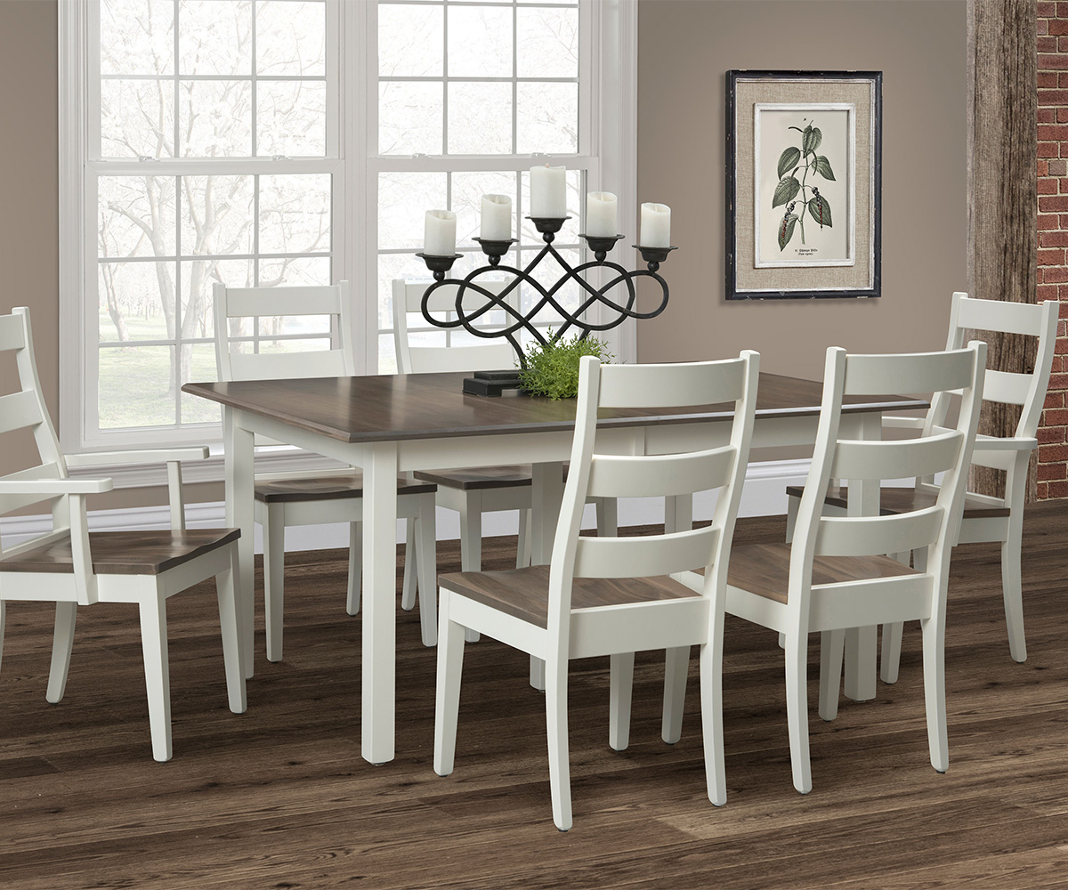Table Shown With: Wood: Brown Maple Base Paint: Country White Top Stain: OCS-133 Shape: Rectangular Edge: Chamfer Leg Profile: M Chair Shown With: Wood: Brown Maple Frame Paint: Country White Top Stain: OCS-133 This Collection Includes: • Easton Table • Easton Chair